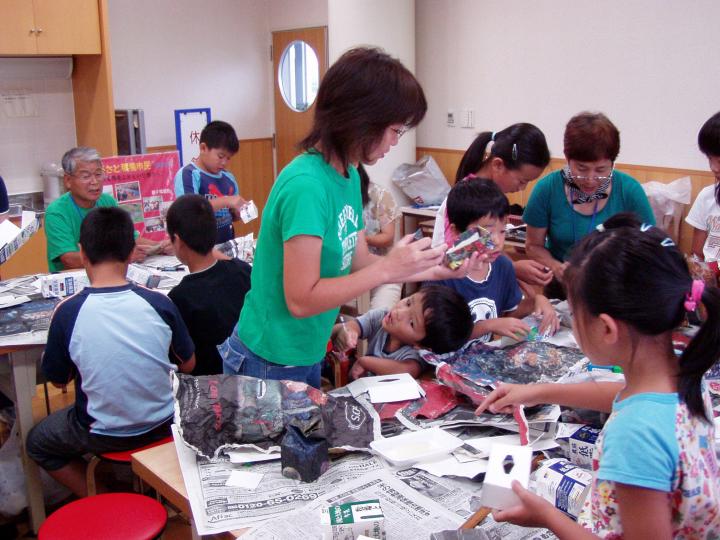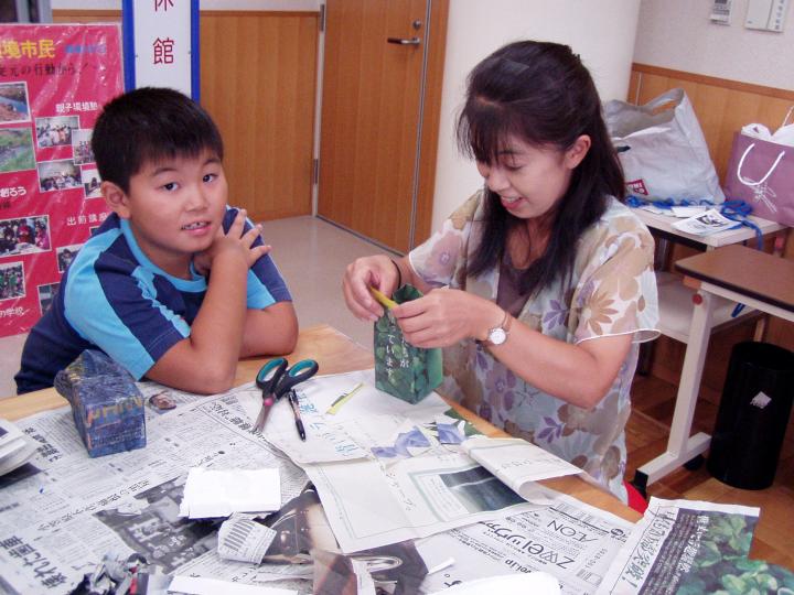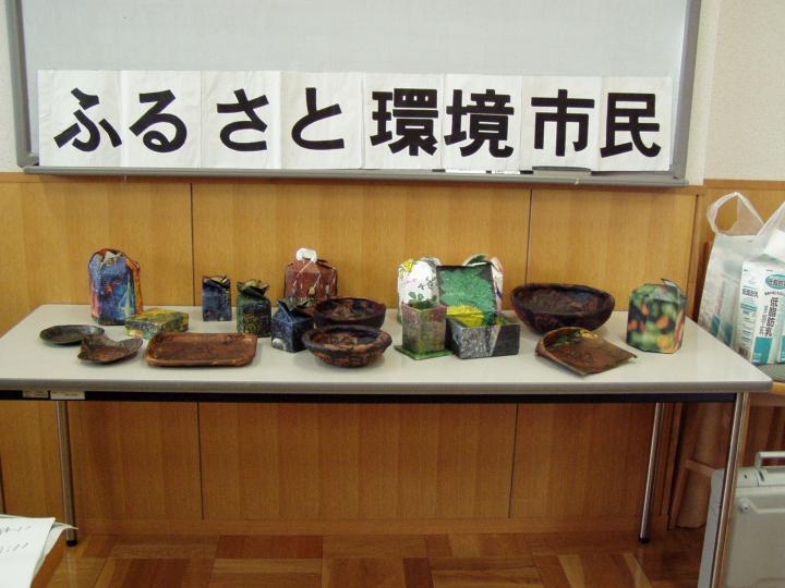 | 8月25日ふるさと環境市民主催、恒例の「夏休み親子環境塾・牛乳パックで作るおしゃれな小物」が開催されました。それぞれの好みで新聞紙の色や柄を選び、「世界で一つのマイ作品」が出来上がりました。温暖化や紙、割り箸、についてのミニ学習会、クイズなどもあり、楽しく充実した夏休みの一日だったようです。 |