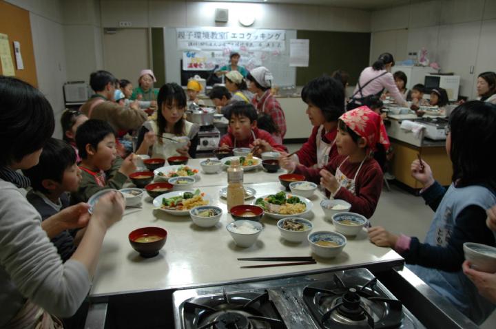 親子30数名の参加があり〈一つの鍋から5品目〉のエコクッキングに挑戦!