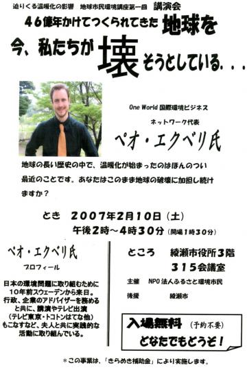 ONE WORLD国際環境ビジネスネットワーク代表のペオ・エクベリ氏を講師に迎え、地球の長い時間の流れの中で、私たちの生活が温暖化にどのようにかかわってきたのかを探ります