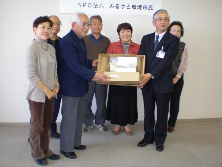 太陽の光を集めてクッキングのできる「空レンジ」を市内小・中学校で環境学習に使ってもらおうと、教育委員会に寄贈いたしました。