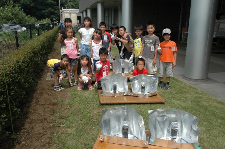 7月25日 綾瀬市環境保全課主催による子ども環境教室「ミニソーラークッカーを作ろう」がリサイクルプラザで開かれました。参加者は子供たち14人とそのお母さんたちです。大型ソーラークッカーでごはんを炊いたりお湯を沸かしたりしながら、子供たちはミニソーラークッカーの製作にとりかかりました。