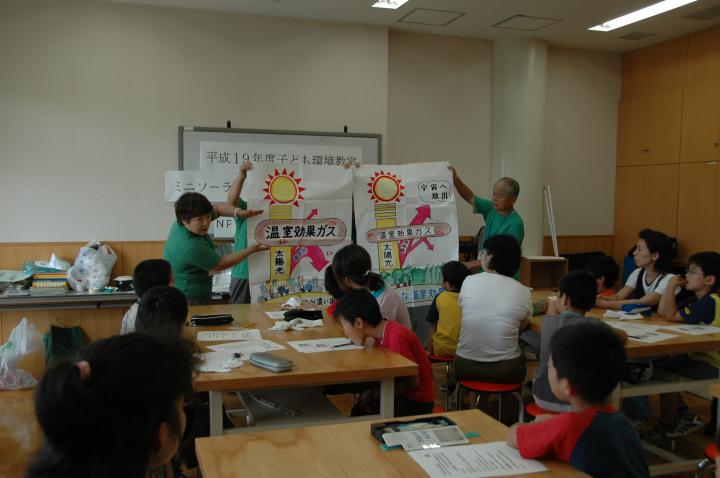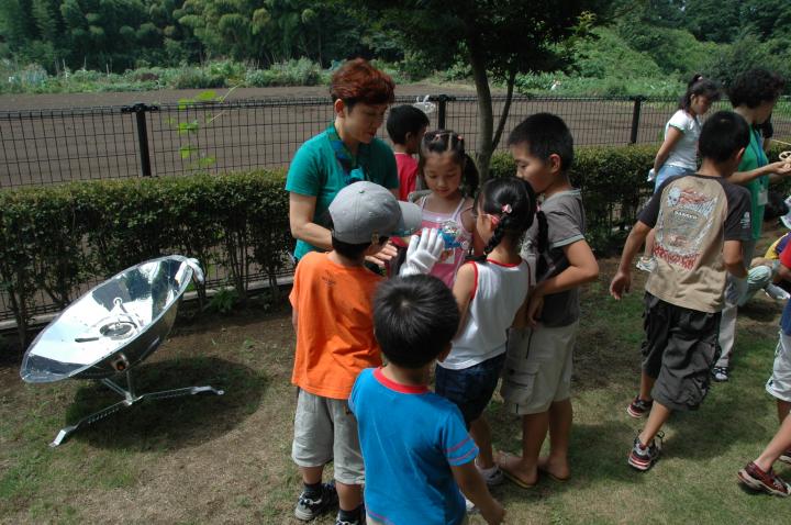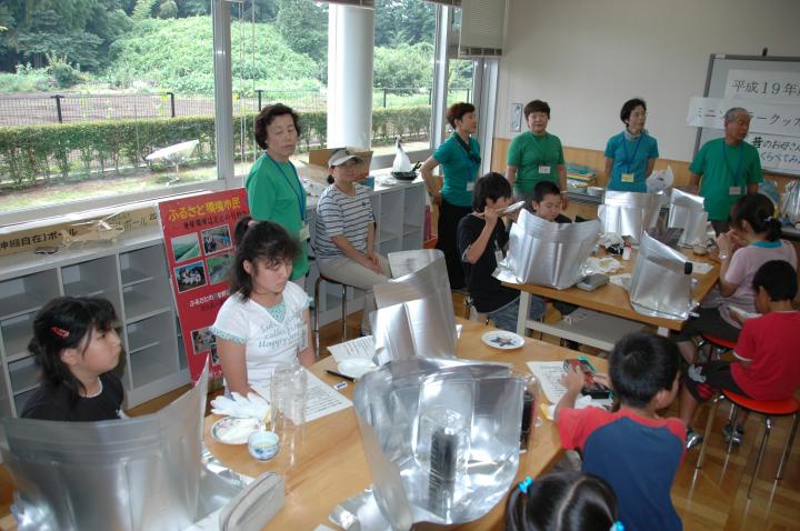 環境にやさしい太陽の光を利用したパネル型のクッカーをみんなで作りました。クッカーの材料は市販のレンジフードを利用し、講師の指示の下で寸法を取りながらハサミできりこみを入れ完成させてゆきました。調理材料を入れる空き缶は、光の吸収を良くするために黒い色を水性ペンで塗りあげていました。幼稚園児にでもできる作業もありみんないきいきとした表情でした。さらに、自分達で作ったクッカーでヤキイモ作りに挑戦。今回の環境学習では「作る」「たべる」「考える」を学んだばかりでなく「夏休みの宿題も一つ完成!」 その外に、環境寸劇や温暖化とエネルギーの話をみんなと一緒に楽しみました。