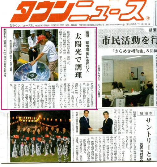 この日の模様は8月17日付けミニコミ誌「タウンニュース 海老名・綾瀬版」で紹介されています。同じく、鳥居ヤス子さんの活動も「今週の人」で掲載されています。