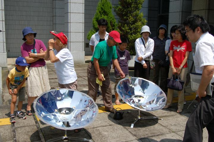 じりじりと照りつける太陽のもとで、みるみるうちに目玉焼きができる様子を見たり、おひさまのちからで沸かしたお茶をのんだりしながら参加された方たちは楽しくすごしていただきました。(文 安藤さん)