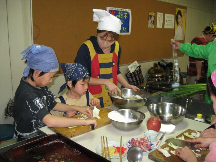 お好み焼きの調理がはじまると子ども達は楽しそうにキャベツやタマネギを切り刻んだり、水で小麦粉をといたり・・・と忙しそうでした。おやつには「焼きリンゴ」を作りパーティのように盛り付けたグループもありました。できたばかりの「お好み焼き」や「焼きリンゴ」を食べながら「天ぷらうどんの材料はどこの国からくるのでしょうか?」と言うクイズに子ども達は一生懸命にお母さんと考えていました。大豆・小麦粉・エビなどの原材料が殆ど海外から輸入しているのです。短時間でしたが身近な食べ物から親子で環境を考える有意義なひと時であったようです。(文:西さん)
