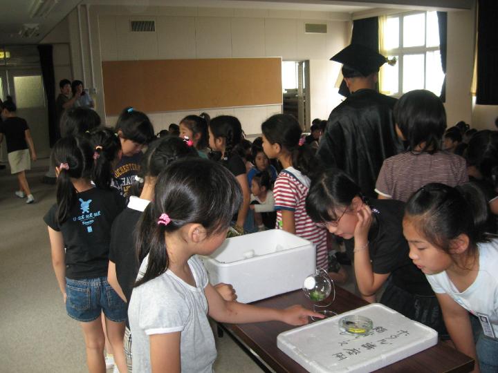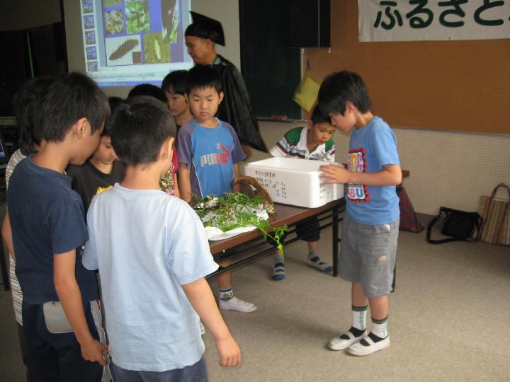 はじめに「ホタルを見たことある人、手を上げてください」・・と言うと3/4位の子供たちがみていると挙手。ほとんどが両親や祖父母に連れて行ってもらっているとか。ホタルへの関心が強いことを示します。
