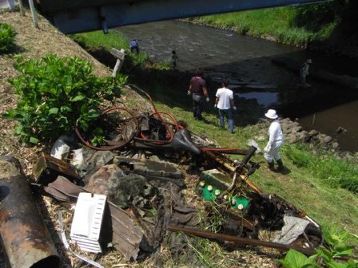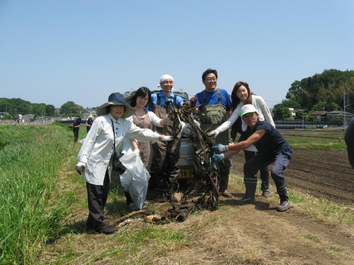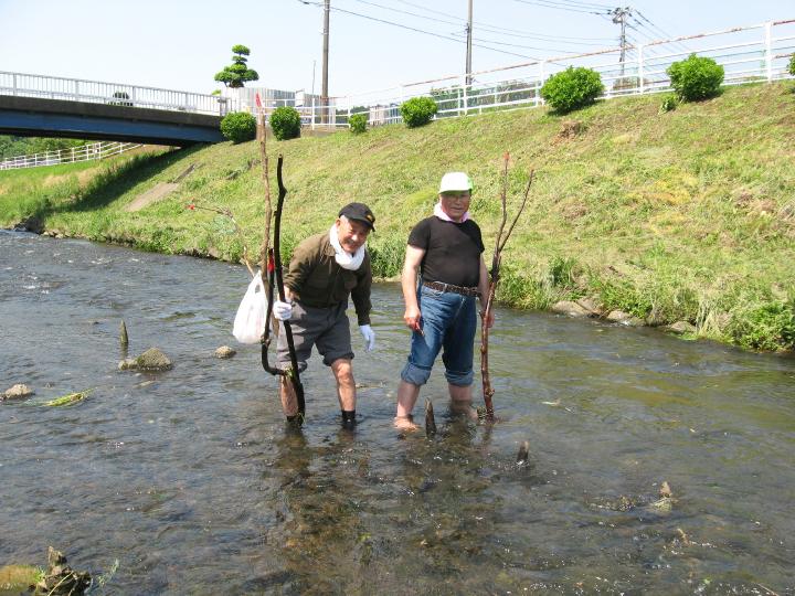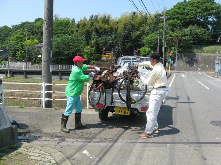 ここ数年の参加者は、綾瀬市区間は50名前後で清掃活動をしてきました。活動形態は「ふるさと環境市民」主催から、川流域全体の統一組織である「綾瀬環境ネットワーク」に移行し、「ふるさと環境市民」は運営面で協力をしていこうということになり、多くの市内団体と個人が参加してくれるようになりました。今日はなんと102名もの人たちが集まってくれて、会場の吉岡地区センターが満員になりそうな盛況でした。回収したゴミは約2トン、自転車は6台もつりあげました。川に入って川底の粗大ごみを大勢のひとたちで「えんやこらー」とひきあげるのは大変でしたが、みんな5月の太陽に負けないくらい輝いた表情でした。