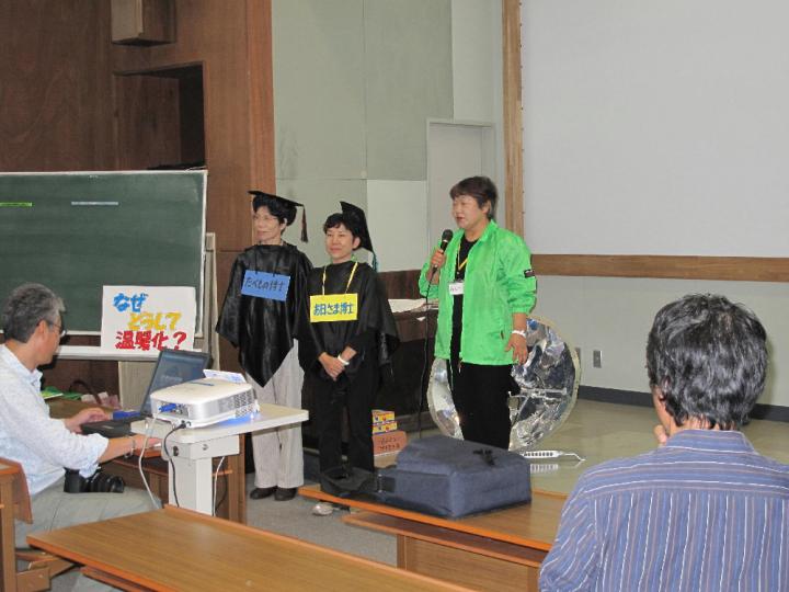なぜ、どうして温暖化になるのかや、原因となるCO2をどうしたらへらせるのか、新エネルギーにはどんなものが有るのか等を話しました。質問コーナーでは「何人ぐらいで活動しているのか」と私たちの活動に興味を持ってもってくれたりして、嬉しかったです。