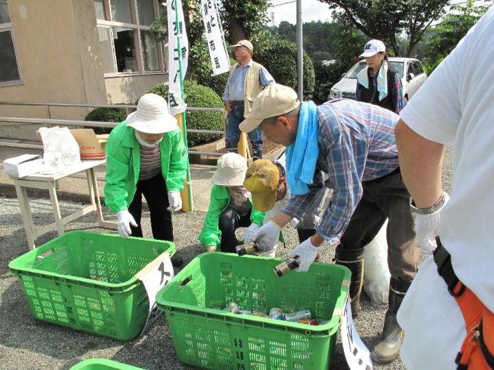 今日はいい天気なのに、集まりが少ない・・寂しいな?原因の一つは近隣の学校の体育祭と重なった事もあります。作業の方法は今回変更になりました。安全のために川の中に入らないこと。収集したゴミは燃えるゴミ・AL缶・スチール缶・ペットボトル等に分別し、用意したカゴに入れることでした。汚れたペットボトルは再生できないので燃えるゴミにする事など細かい注意がありました。今までは品名だけで分別していたことが、市環境政策課の負担になっていたことがわかり、再資源化には汚れているとだめなものが有ると言うことでした。目からうろこがとれた思いでした。