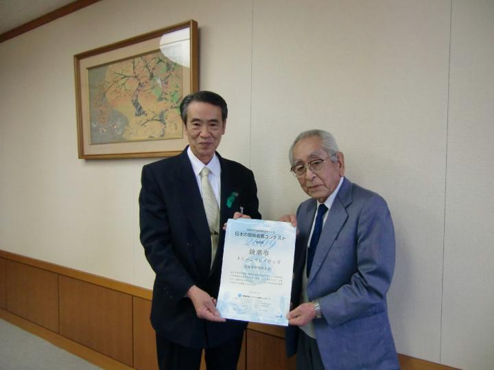 綾瀬市では、今まで「長峰の森」事業や「コミュニティバス」が先進事例としてえらばれていますが、今回はよりすぐれた事例として「ドリームプレイウッズ」が表彰されたのです。ふるさと環境市民はこのコンテストに第一回から幹事団体として綾瀬市の環境政策の前進を支援してきました。そこで、今回の表彰状を全国ネットワークの代理として市長にお渡し致しました。「ドリームプレイウッズ」事業は健康こども部青少年課が所管し、子ども達が自然の中でも遊べるように実行委員の方達と行政が協働して運営しており、特に、そうしたところも評価されました。また、先進事例として「戦略的人材育成プログラム人事3制度」についても評価され、今年度は2つの栄誉を受けられました。これを機にさらに持続可能な街づくりにまい進していただきたいと思うものです。(文: 安藤さん)