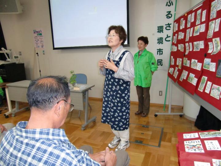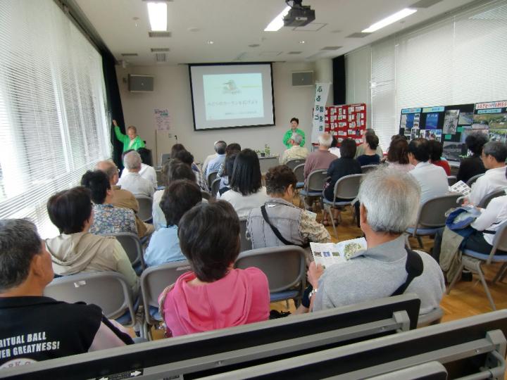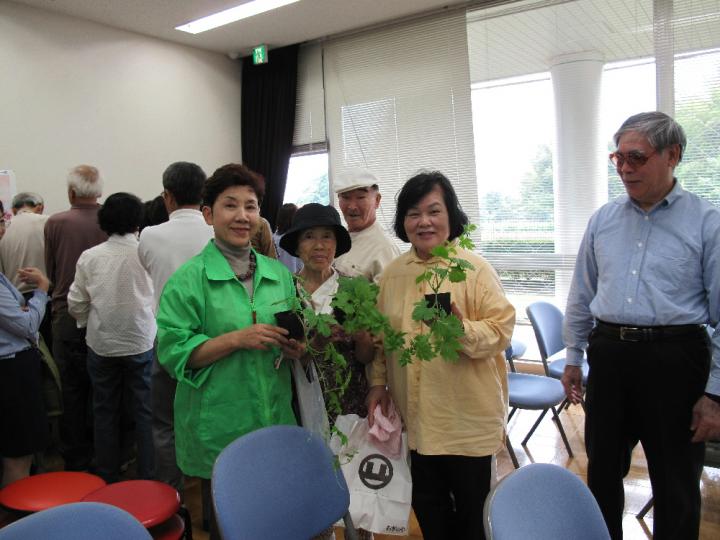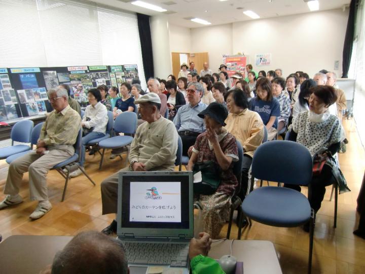 大勢の方が集まり会場は熱気でむんむんしていました。初めに、みどりのカーテンの目的・作り方・使用例を説明した後、苗の配布を行いました。今回、参加された方はほとんどが始めてなので、熱心に耳を傾けて下さいました。「あやせ生(いき)ごみ隊」からも堆肥の差し入れがあり、苗とともに同時配布されました。用意した苗はあっという間になくなりました。