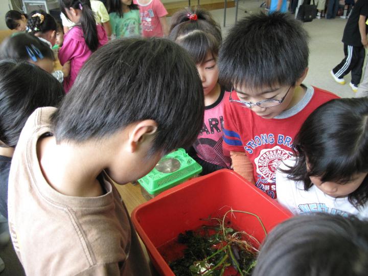 前日にご用意いただいた昆虫や水棲動物は、子供たちの好奇心を持たせるのには格好の材料でした。講座終了後、それらの生き物は生息地に戻しました。子供たちもいきいきと飼育箱の動物たちを観察していましたよ・・・。ホタルだけでなくいろんな生き物がかかわりあって、生息地が構成されていることを理解してくれたようです。