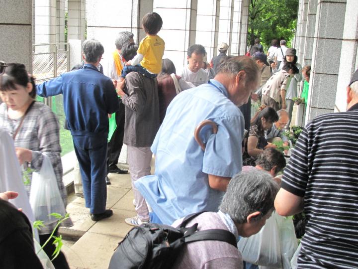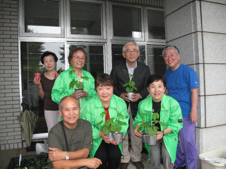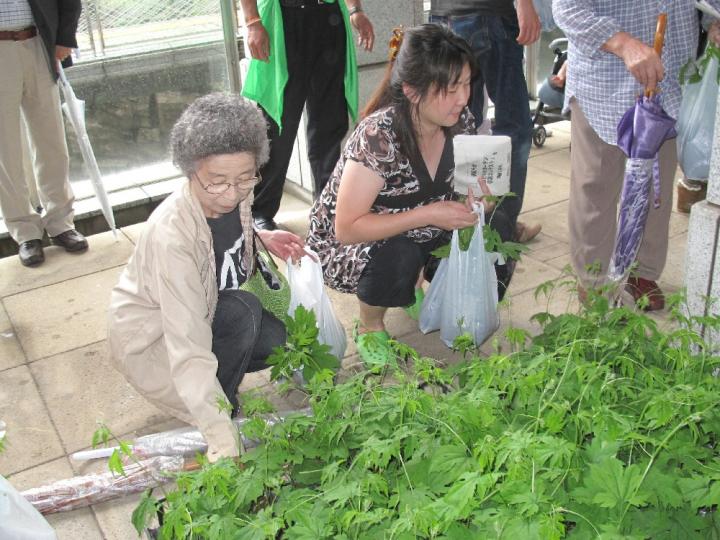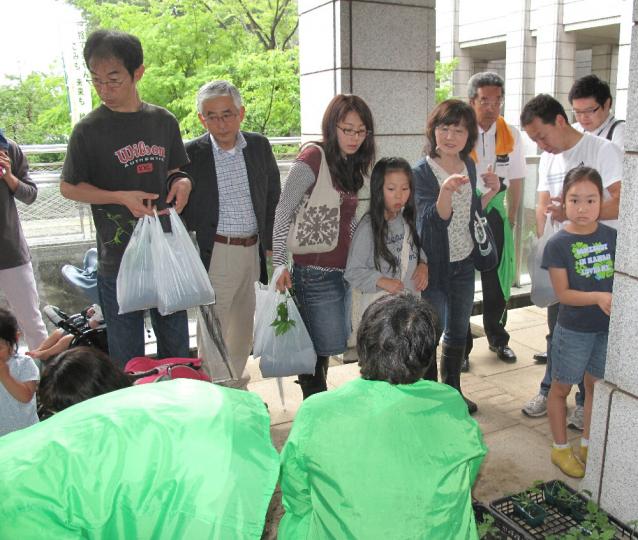 大雨警報も出た悪天候にもめげず大勢の方々の参加がありました。また、みどりのカーテンについての温度差測定モニターに、小学生を含む多数の方たちが参加してくれる事になりました。秋の環境展での写真コンテストとともに楽しみです。「あやせ生ごみ隊」からは生ごみ堆肥についてのお話の後、綾瀬市が用意したゴーヤ(300個)や環境団体が用意したへちま・フウセンカズラ・朝顔・ヘチマ等の苗(計100個)と堆肥などの配布がありました。
