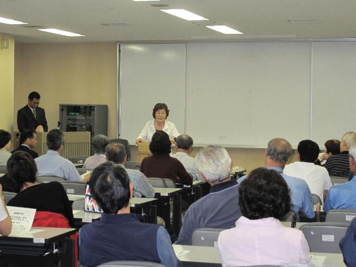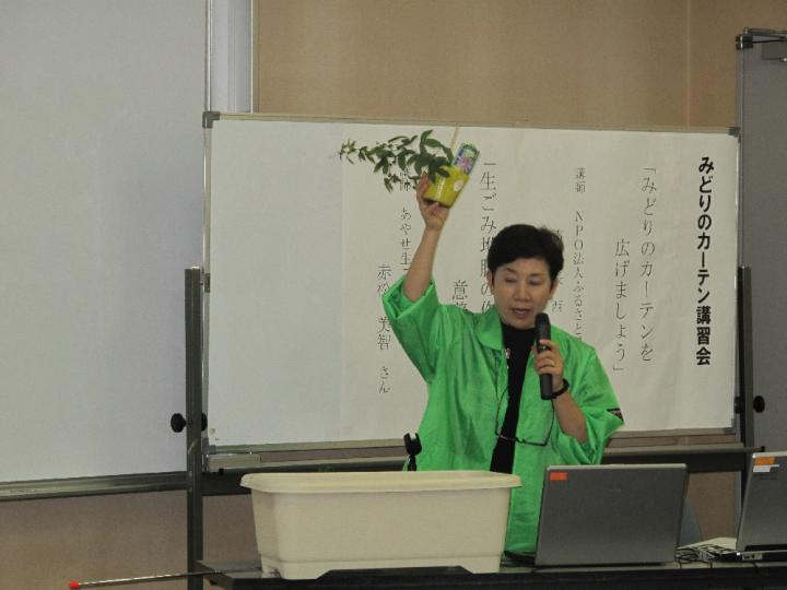 今年からは、あやせ環境ネットワーク主催となり「みどりのカーテン講習会」で、昨年までのみどりのカーテンへの取り組みや写真コンテストの様子などを映像で紹介した後、ゴーヤ・フウセンカズラ・朝顔・ヘチマ等のつる性植物の育て方やプランターやネット等の用具についてのお話をしました。