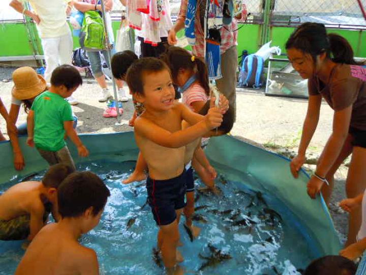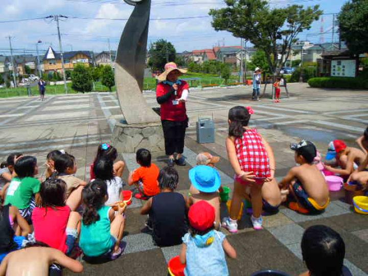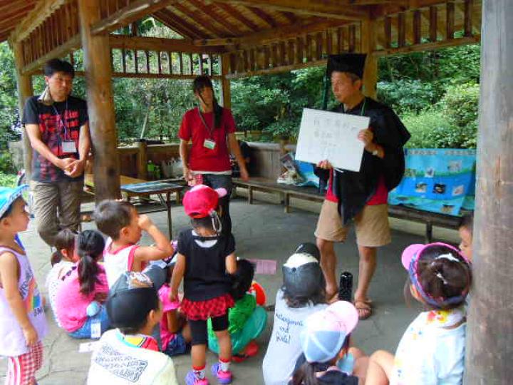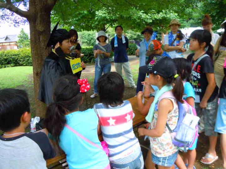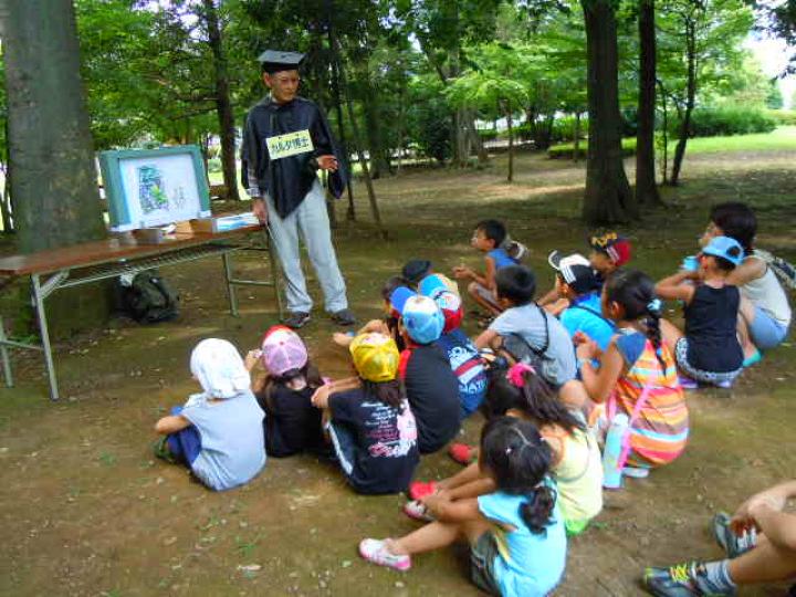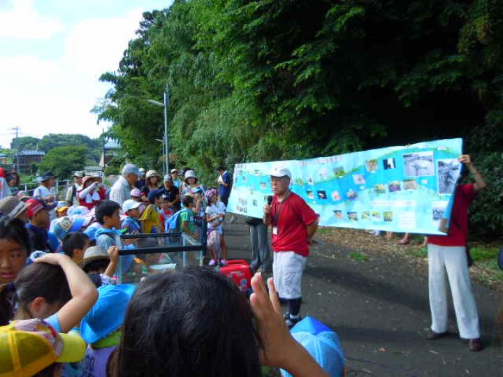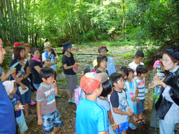 前日からもじりを仕掛けたり魚を釣ったりして準備しました。残念ながらもじりではウナギは取れませんでした。同日午後はカルタ・お日さま・川の歴史・ホタルと4人の博士が登場し、各々の博士が木陰やホタルの生息地でみんなに説明しました。それは森の学校のようでした。また、打ち水大作戦では水のかけっこで大盛り上がりしました。