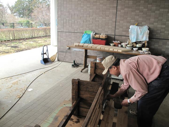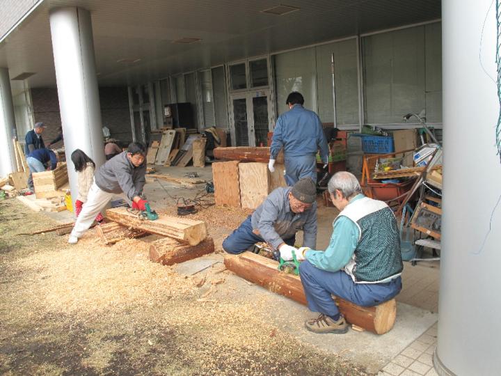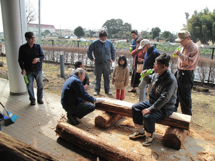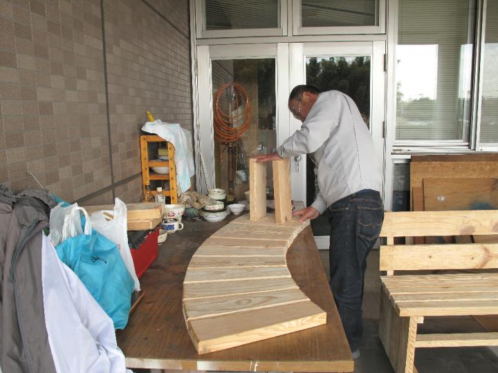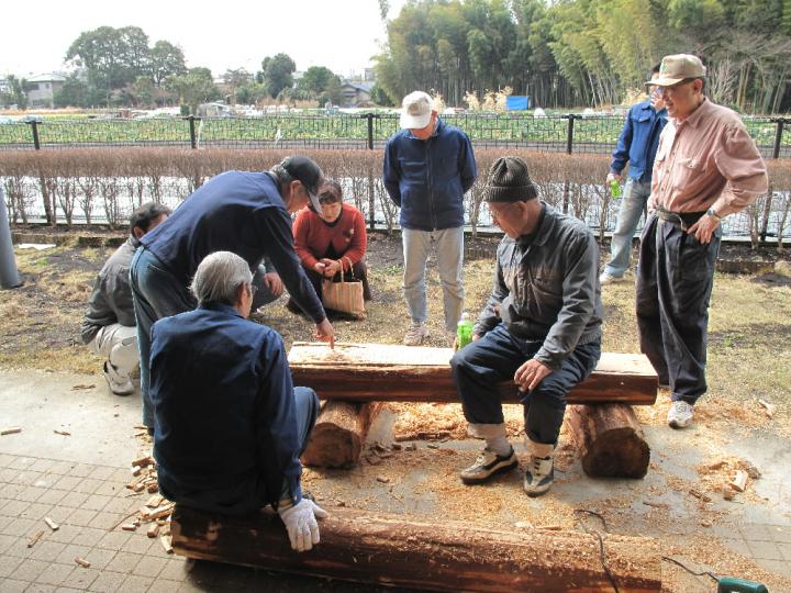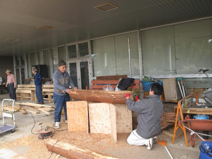 今日から、開始時間が9時になりました。物づくりプロ集団はやる気満々です。「キューン」と言う電動ノコの金属音と共に木屑が散る。ファインダーごしに舞い落ちる木屑は逆光で見ると金箔のようだった。「ブーン」とややにぶい音をたてながら電動カンナが見る間に丸太の一面を平らに削り上げてゆく。そして、次々と組み立てられてゆく。作業も一段と軌道に乗り塗装前の「長尺ベンチ」の半完成品は3台になりました。「扇形のベンチ」は他と少し違ったおもむきのものになりそうで木材の型取りは済み、パイプを曲げた補強材待ちです。補強材のベンダーパイプは綾瀬市の工業団地の皆さんが目に見えない応援をしてくれています。「丸太ベンチ」はチェーンソーと電気カンナで削り出していましたが意外と手間のかかる一品です。昼食時間には進捗状況の確認やすわり心地や安全面についての談義に花が咲きました。