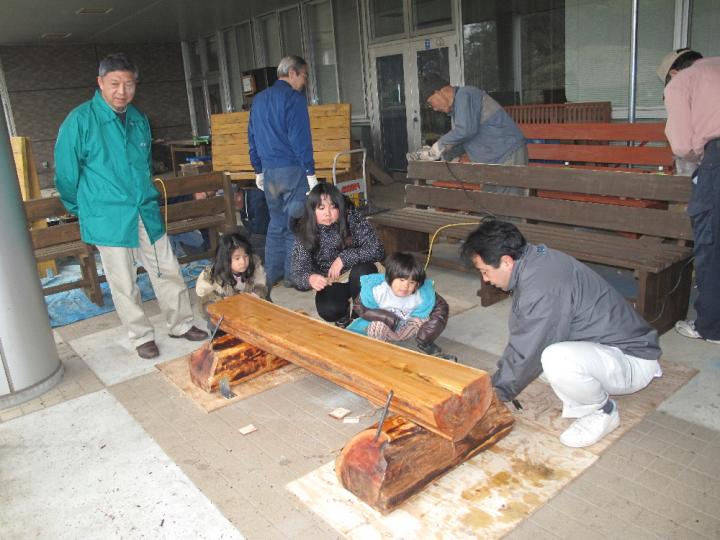 丸太のベンチ一面を平らに削る作業中、ムカデやアリが這い出してきました。休眠を妨げられて大あわてのようで少し可愛そうな気持ちになりました。さて、今回参加いただいた皆様本当にお疲れ様でした。汗と情熱と心のこもった素晴らしい記念のベンチが出来上がりました。そして、綾瀬を愛する人たちがこんなに沢山いることがとても嬉しく思いました。