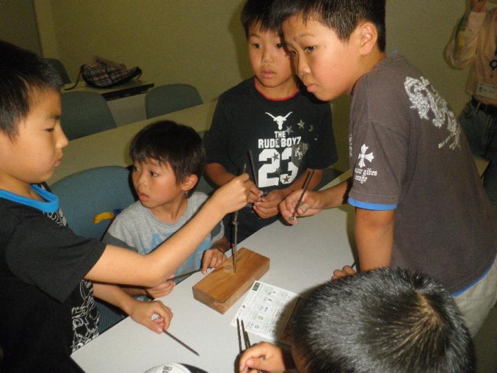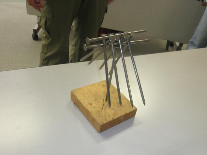 なかなかわかりません。実は10センチ近い釘でした。その釘を1本立ててそのうえに「10本のくぎをのせてみてください」と。おとなチームとこどもチームに分かれて挑戦してみましたがむずかしい。正解は写真のとおりです。野呂さんはこの体験をとおして「いろいろな考え方やアプローチがあるよ」ということを教えてくださいました。