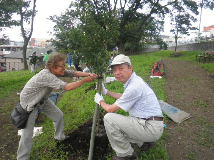 植木屋さんの宮治さんから植え方のお話と百日紅(さるすべり)と花みずきを5本づつ並木道になるように植えました。