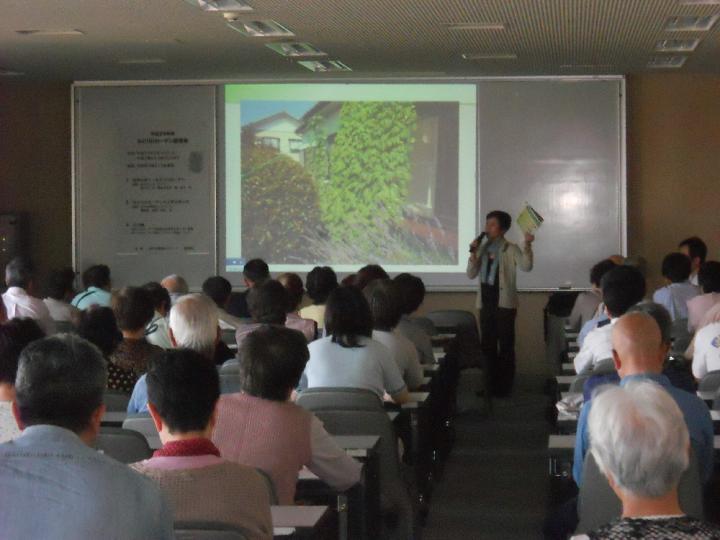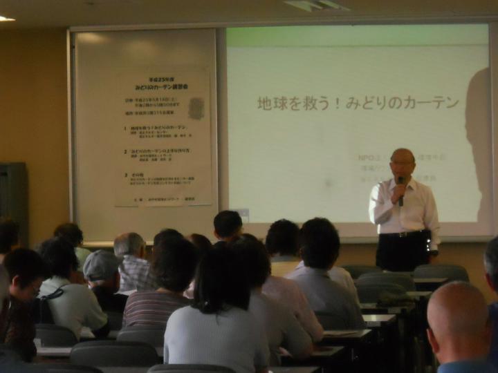 はじめてカーテンに挑むという方も多く講師のお話しを熱心に聞いておられました。プログラムは「地球を救うみどりのカーテン」と題し、ふるさと環境市民の事務局長のかたわら「省エネルギーセンター」の指導員を務める西寿子さんにより、パワーポイントを使っていまの地球がかかえる温暖化の影響に対してCO2を減らすことのたいせつさや自分に何ができるかということについて説明しました。そのために「みどりのカーテン」がいかに役に立つのかを話されました。単に美しいだけでなく地球を守ることのできる「みどりのカーテン」のすばらしさに多くの方に気づいていただけたことでしょう。そのあとは、環境ネットワークの高澤良夫さんより「みどりのカーテンの作り方。育て方」について具体的なお話がありました。土や水やりなど質問も多く寄せられました。ふるさと環境市民が独自に続けてきた活動がこのように実ってきたことは本当にうれしいことです。また、今年も温度計を5個寄付し、カーテンの内外の温度を測っていただくこともおねがいしました。ぜひ、その温度差を実感してほしいものです。
