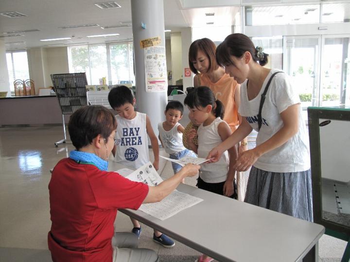 さて、バックづくりが終わってからは「もったいない博士」といっしょに「もったいない」ってどんなことかな?・・を考えたり、綾瀬市のごみはどれくらいあるのかな・・ということをリサイクルプラザの小森さんにおしえてもらったりしました。夏休みのひととき少し勉強にもなったでしょうか?これからも続けていきたい企画です。ボランティアとしてきた3人の高校生のお手伝いありがとうございました。(文:安藤さん)