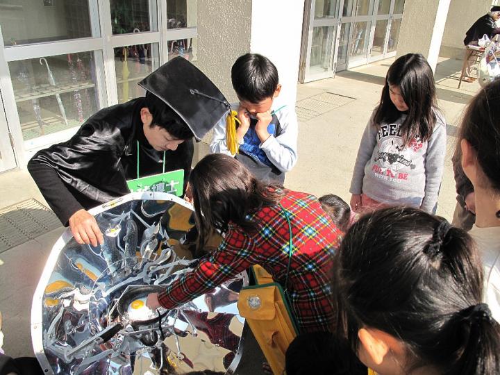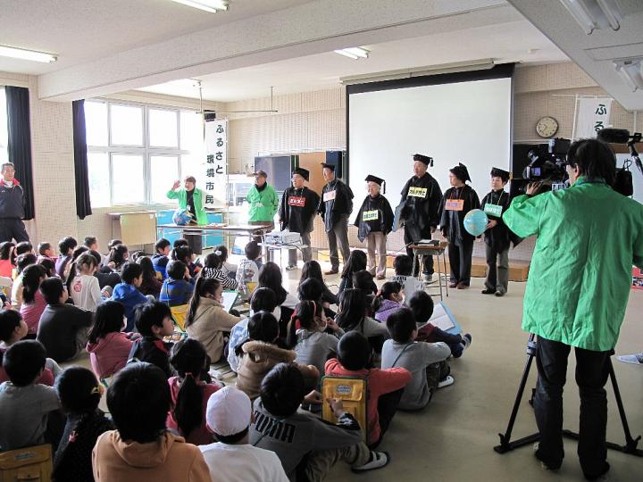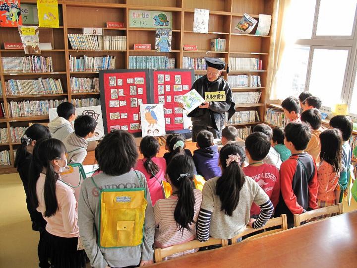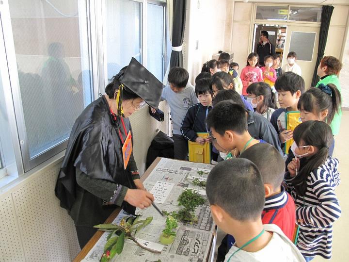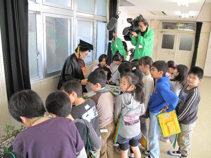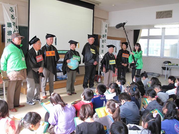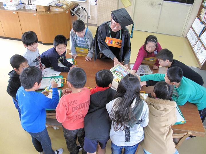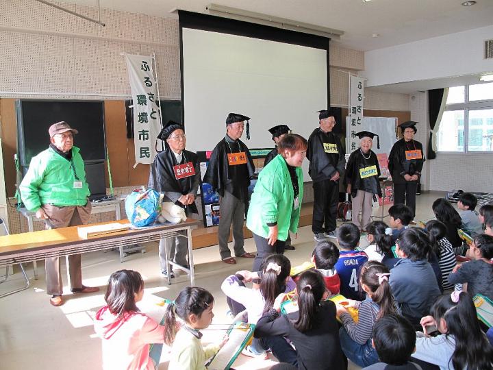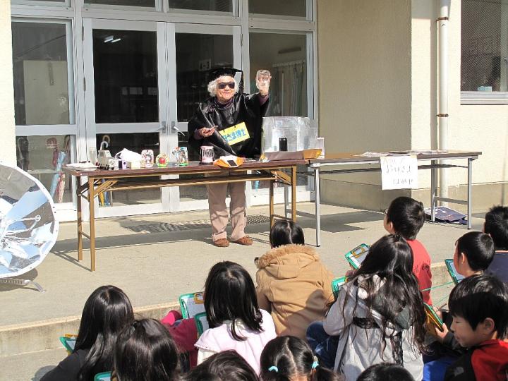 くっきりとした青空のもと6人の博士が勢ぞろいしました。草花、エネルギー、カルタ、地球、お日様各博士もみんな楽しそうでした。昨年6月にホタルの話を聞いているので子供たちもなじみになっている博士の話を一生懸命聞いていました。授業では、温暖化で困っている白くまくんの話、世界中で干ばつや大雨などの異常気象が起きていること、便利な生活の裏に潜む地球の悲鳴をわかりやすく博士が話してくれました。そして、自分たちにできる温暖化対策も一緒に考えました。