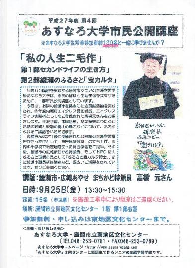 ºÂ´Ö»ÔÅìÃ϶èʸ²½¥»¥ó¥¿¡¼¤Ç³«ºÅ¤µ¤ì¤¿¡Ö¤¢¤¹¤Ê¤íÂç³Ø¡×¡ÊºÂ´Ö»Ô¹âÎð¼Ô³Øµé¡Ë¤Ç²ñ°÷¤Î¡¡üâ¶¶¡¡¸µ»á¤¬¹Ö»Õ¤ò¶Ð¤á¹Ö±é¤ÎÃæ¤Ç¡Ö¤Õ¤ë¤µ¤È¤ÎÊõ¥«¥ë¥¿¡×¤Î¾Ò²ð¤ò¤·¤Þ¤·¤¿¡£