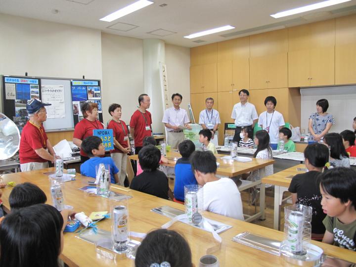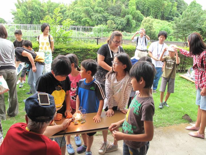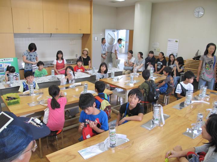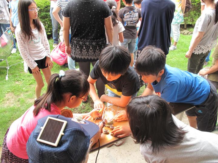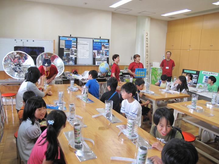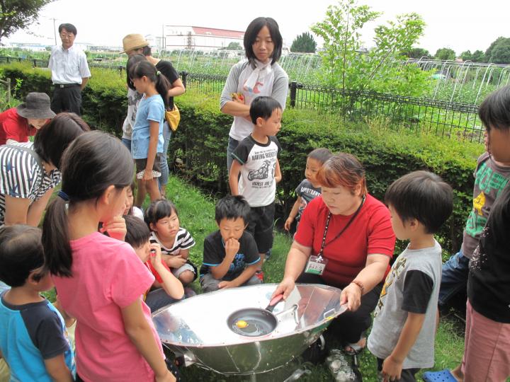 お日さまをはじめとする自然エネルギーや電気、地球温暖化防止について勉強しながらミニソーラークッカーを手作りします。アルミパネル、空き缶、ペットボトルを使って太陽の熱を集めて調理します。時間も短いのでウインナーソーセージをあたためることにします。時間をかければお芋やゆでたまごも可能です。また、大型のクッカーで目玉焼きをしましたが残念なことにくもり、、、、。普段5分でできあがるものが20分ほどもかかり子供たちをあっといわせることができませんでした。それでもほどよくあったまったソーセージからたちのぼるおいしそうな匂いにみんな大喜びをしていました。自由研究ノートにかきこめるようなお勉強もできたでしょうか?