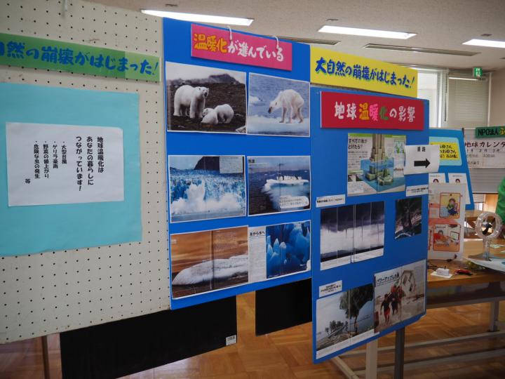 ステージでは西さんのお話しからはじまり、クイズでゴーゴーや東洋ガラスさんによるガラスのランタンづくり、工房室では「押し寄せる温暖化」をテーマに氷が解けて餌がとれなくなったためにガリガリにやせた北極グマや、ツバルの写真などの展示、また、節電や風力発電のしくみを体験できるような設備、鳥居さんのソーラークッキングで焼き芋やポップコーンの試食などをおこないました。