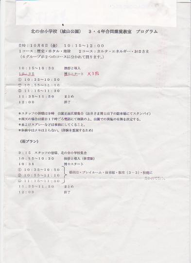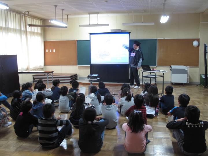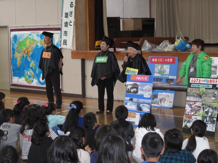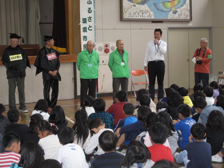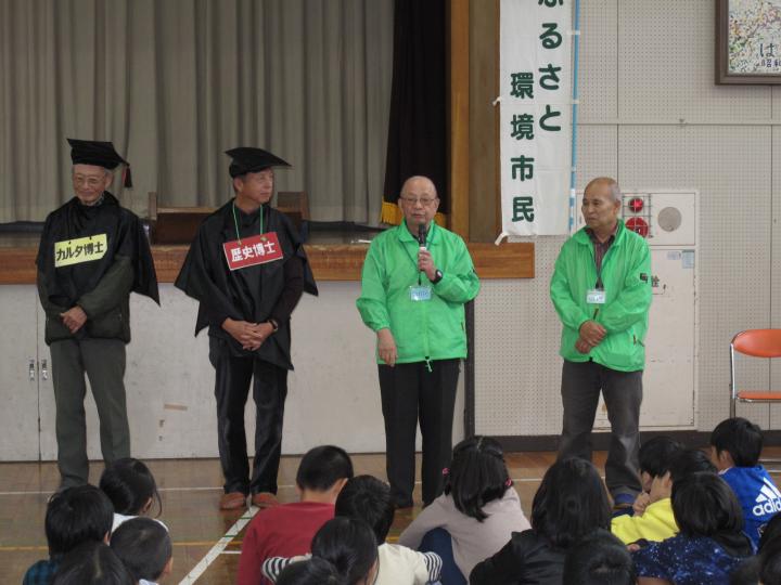 城山公園で6人の博士を順番に回って教室での勉強とちがった体験で環境や綾瀬の歴史、地球の水のこと、エネルギーのこと・・さまざまなことを博士に教わることになっていましたが午後からの雨予報で残念ながら学校の体育館で同じようにおこないました。
