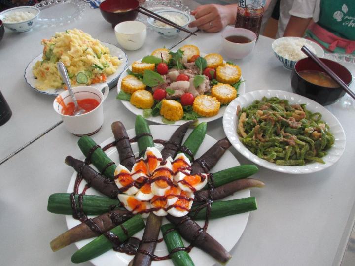 地域で生産された野菜やお肉を使って「1つの鍋から5品目」というメニューで、オードブルやポテトサラダ、ピーマンの胡麻和え、夏野菜のおでんなどです。