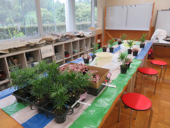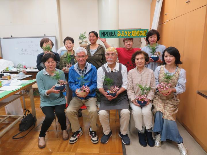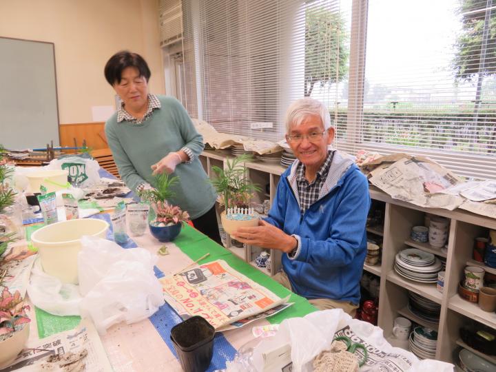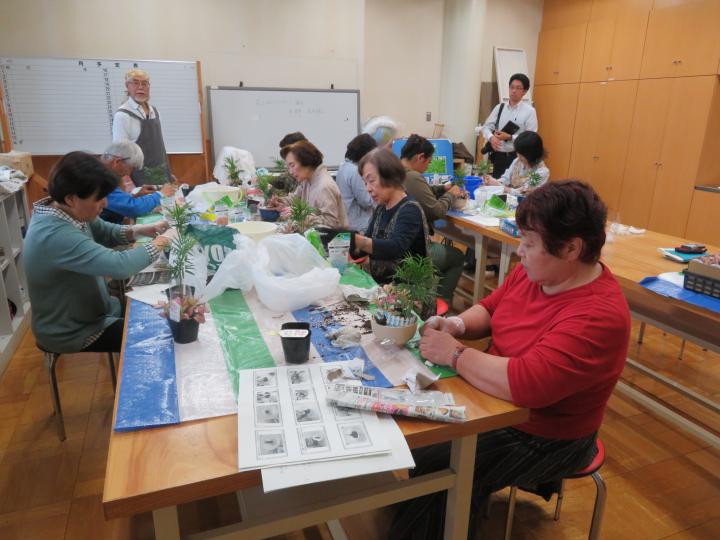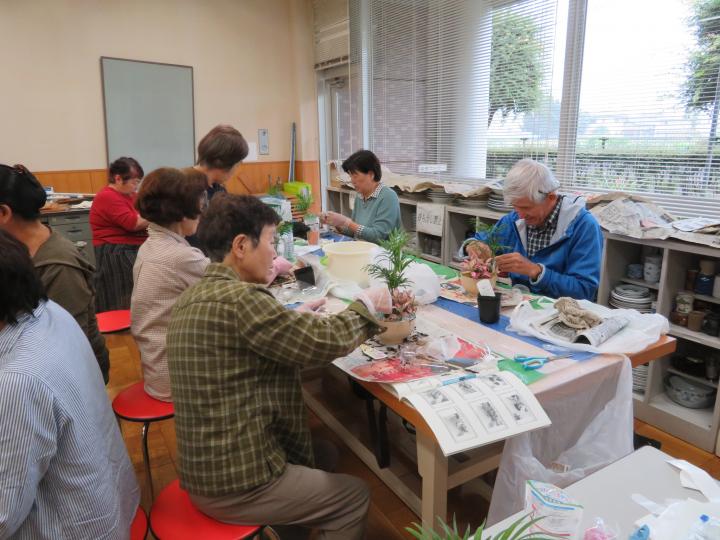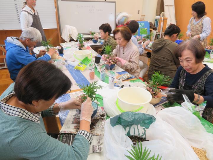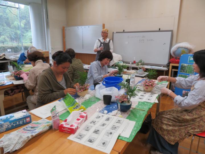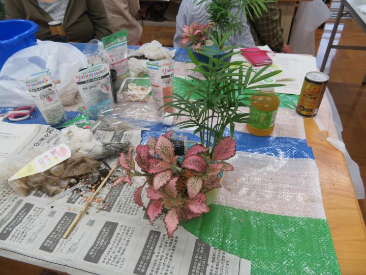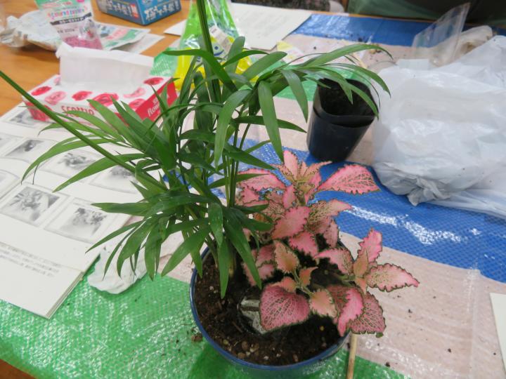 まず、ミニチアのヤシに表がと裏があることを知る。土を入れて座りを良くして表を決める。順次、通気性をよくするネットを筒状に巻き土を入れ化粧土で整えた。この間約2時間。皆、満足そうな顔で終了。日頃使用していない感性というものを久しぶりに使ったような気がする。