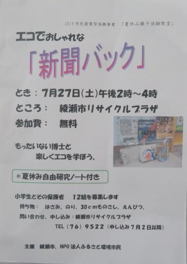 真夏の青空の元、新聞紙をつかって可愛いバッグをつくりました。英字新聞や素敵なカラー使いの紙面を利用してノリとハサミだけで出来るエコバックだ。まず、表に出したい紙面を選び裏になる紙面とをノリで貼り合わせるのだが、カラー刷りの果物やドラえもん、綺麗なお花畑など紙面選びが楽しく賑やかに作業が進みました。お弁当入れやギフトバックにもちょうど良いミニトートバッグから、ワインボトルが入りそうな縦長のバックまでさまざまなバックが出来上がりました。最後に、リサイクルプラザの方から3Rについてのお話や綾瀬市のゴミの現状についての話がありました。
