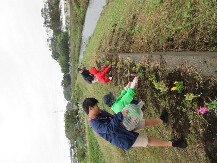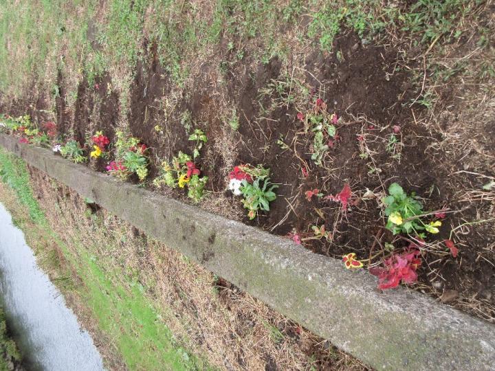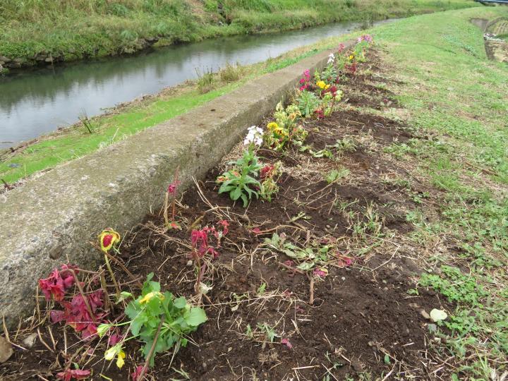 10月12日に予定して、色々な準備を図っていたのに台風19号襲来!はとても外に出られる状況になく残念ながら中止となりました。翌々日の14日に日程変更し実行しました。チラシを見て初めて参加してくれることになっていた方達もガッカリしていた事でしょう。とは言え花の苗は予約していただけになんとかせねば・・・と、14日になってから関係者だけで植生しました。幸いなことに土手の草刈りをしっかりとやってもらっていたので前回ほどの大変さはなく1時間ほどで作業を終えることができました。運よく雨がパラついてきたので水やりの心配もなく有り難かったです。道行く人たちが喜んでくれるといいなと思いながら帰路につきました。(文:安藤さん)