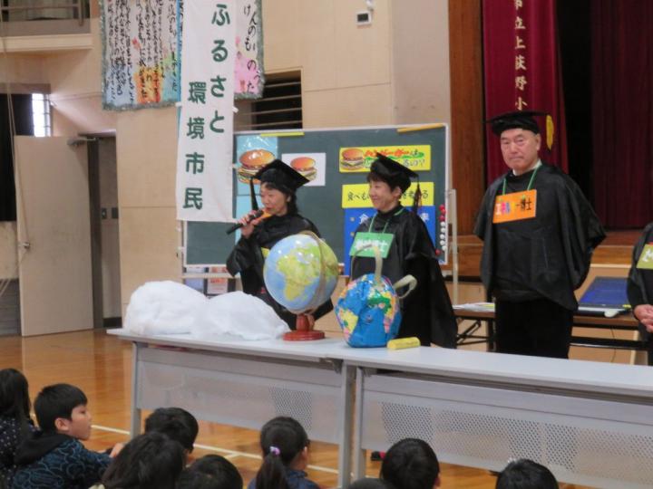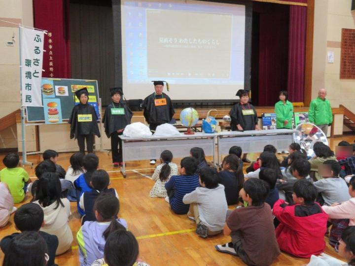 前半は「ハンバーガーはどこからくるのかな?」の題名で環境出前講座を行いました。