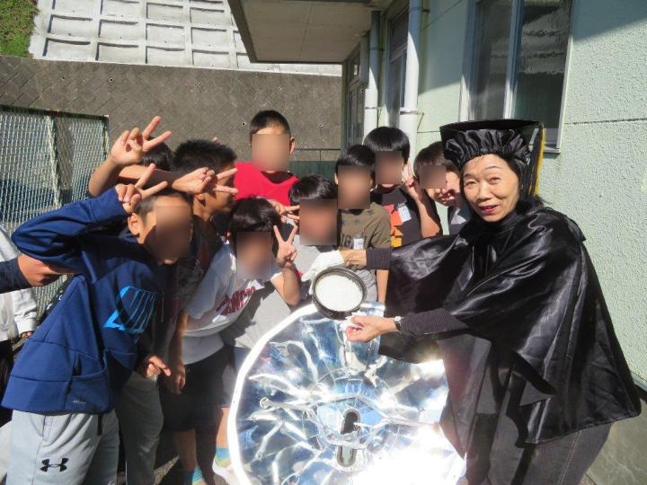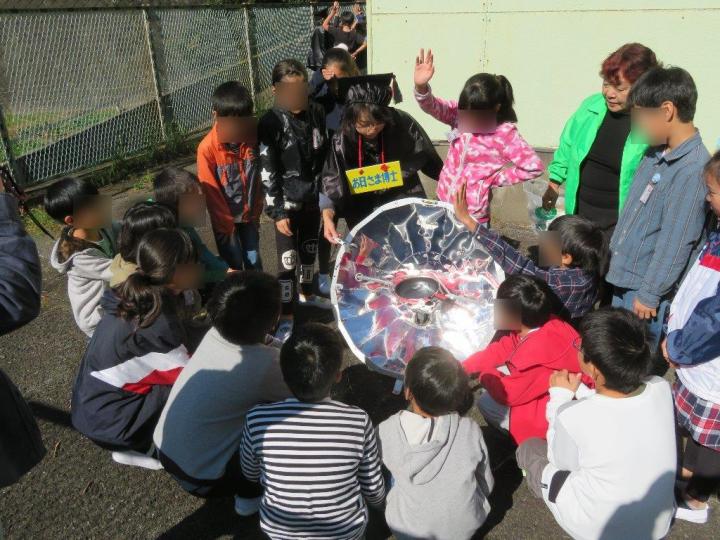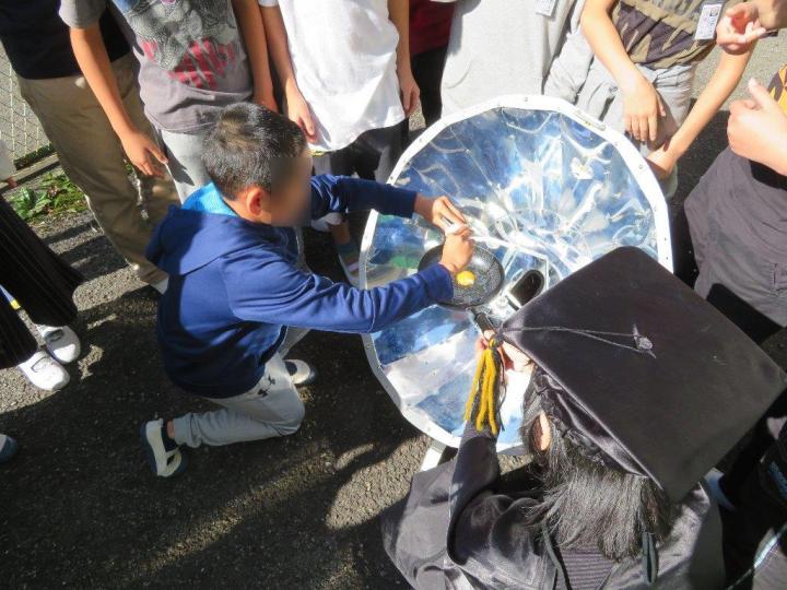 後半は屋外でソーラークッカーを使いご飯を炊いたり、目玉焼きを作ったりしました。また、ソーラー電池で動くバッタやドラえもんのおもちゃに驚いたり笑ったり、とっても素直で明るい5年生でした。(文:藤村さん)