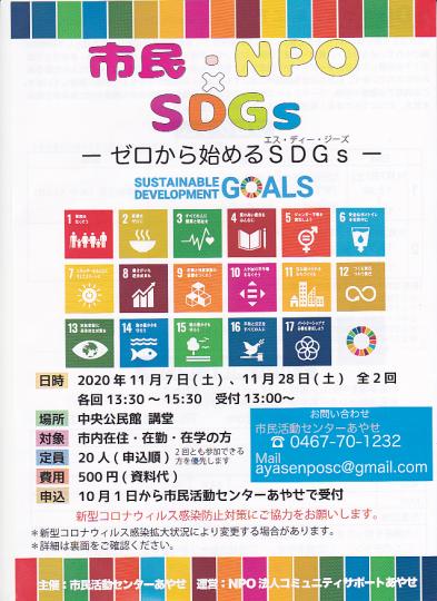 持続可能な開発目標として国際的に掲げられているSDGsについての学習会が市民活動センターあやせの主催で11月7日(土)中央公民館にて開催されました。