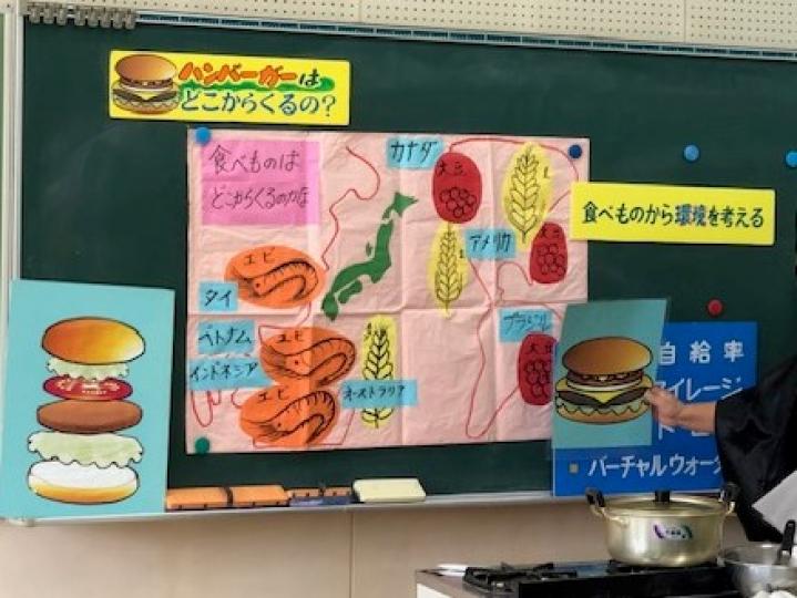 お肉に火が通る時間を利用して、「ハンバーガーはどこから来るのかな?」というテーマで食べ物から環境を考えてもらいました。