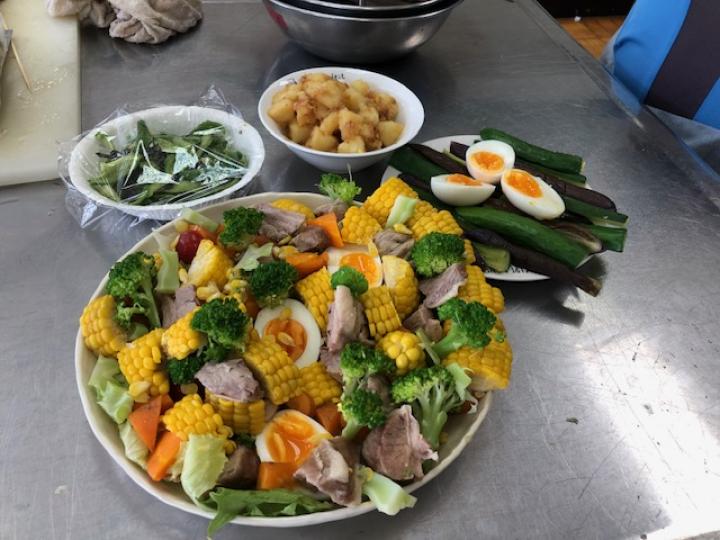 食べ物のごみを少なくし、調理のエネルギーを節約する工夫をしながらひとつの鍋で前菜、主菜、スープなど5品目を作りました。