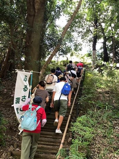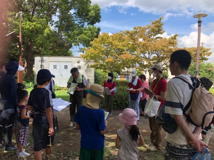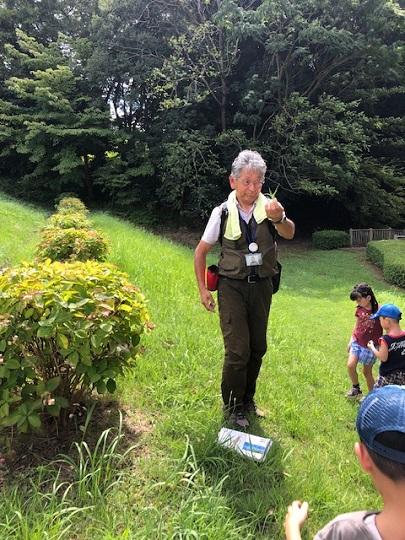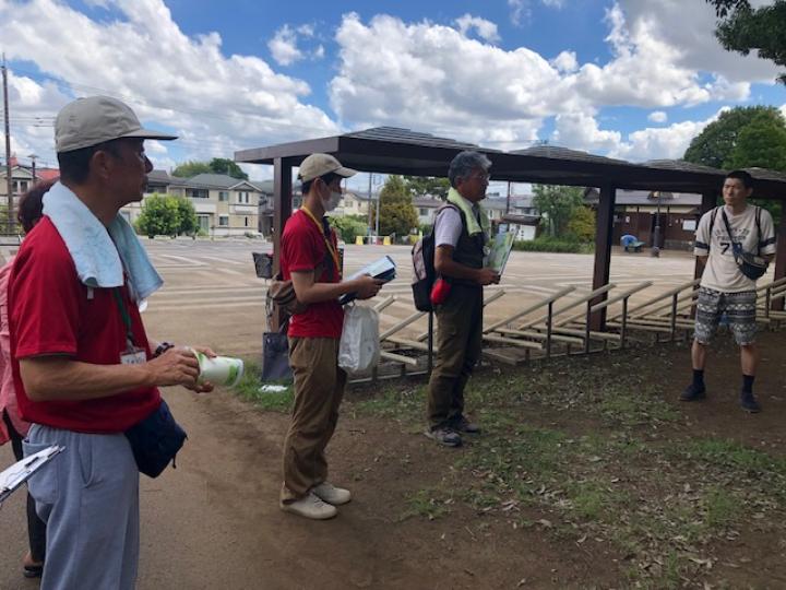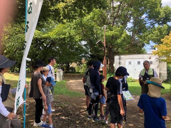 城山公園の入口広場に集合し、講師の佐藤先生(かやねずみ先生)からの説明を聞いてみんなで出発。