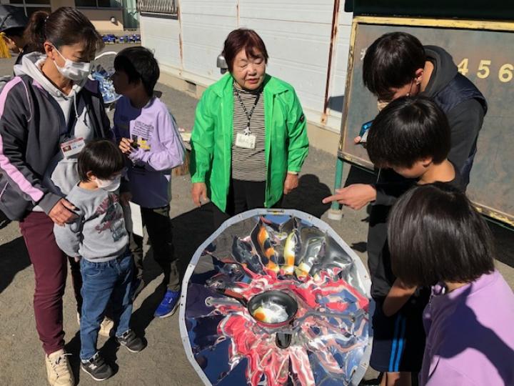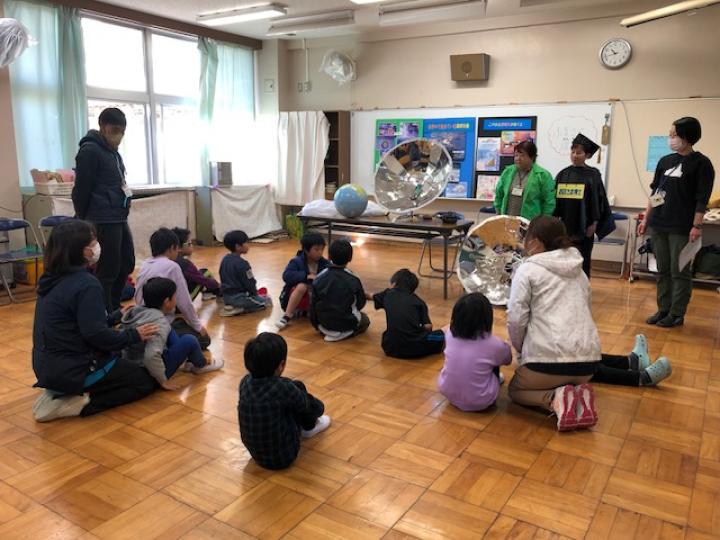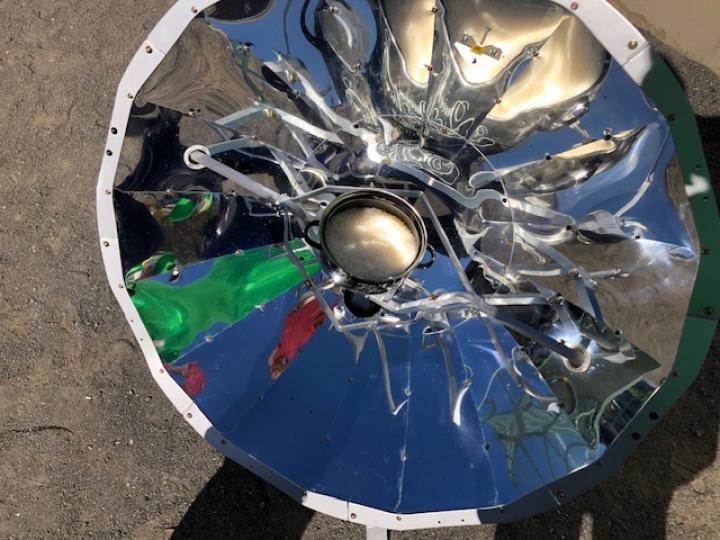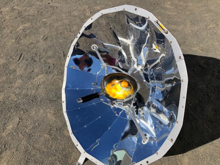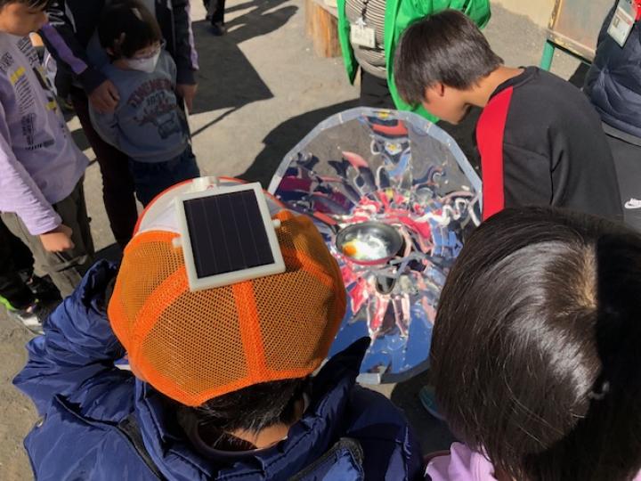 そこで地球儀を使いながら温暖化とCO2との関係をお話しした後、校庭で大型ソーラークッカーを使ってご飯を炊いたり、目玉焼きを作りました。