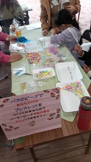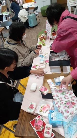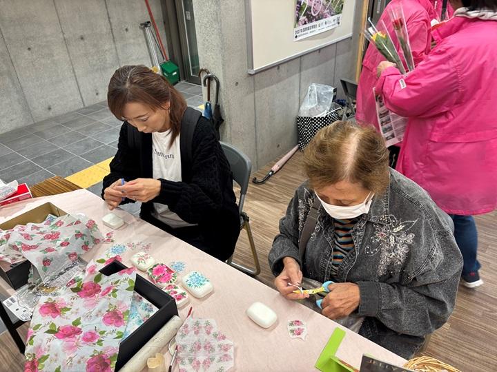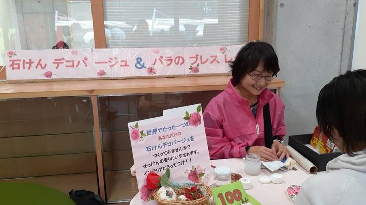 ローズフェスタ2024では、ミニバラ、切りバラ及びバラ苗鉢をはじめバラにちなんだ商品のキッチンカーや物販、ワークショップなどの店舗約20店舗が立ち並ぶはずでしたが、あいにくの雨のため、ほとんどの店舗が出店を取りやめ、少し寂しいフェスタになりましたが、私たちの「石けんデコパージュ&バラのビーズのブレスレット」はたくさんの方々が参加してくださり好評でした。